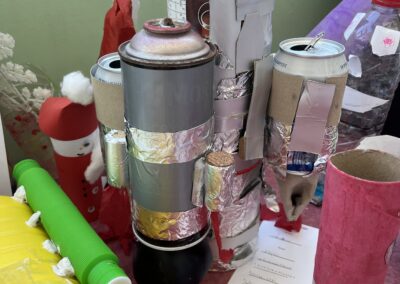 Οι μικροί μας δημιουργοί έδειξαν τη φαντασία και την ευρηματικότητά τους, μετατρέποντας καθημερινά αντικείμενα σε μοναδικά έργα τέχνης. Από πλαστικά μπουκάλια και χαρτόνια μέχρι κουτιά και καπάκια, κάθε υλικό βρήκε νέα ζωή στα χέρια των παιδιών μας. Πύραυλοι με φαντασία έτοιμοι να πετάξουν στο διάστημα, πολιτείες γεμάτες ζωή, ευφάνταστα παιχνίδια ερωτήσεων, παραδοσιακά πηγάδια, στολιδάκια με χρώμα και άρωμα, ρομποτάκια έτοιμα για δράση, Αγιο-Βασιλάκια που ξέμειναν… Στη συνέχεια, η έκθεση αυτή έγινε η αφορμή για να εξασκηθούν τα παιδιά στο κείμενο της πρόσκλησης και της συμπλήρωσης λίστας με τα υλικά που χρησιμοποίησαν για την κατασκευή τους.