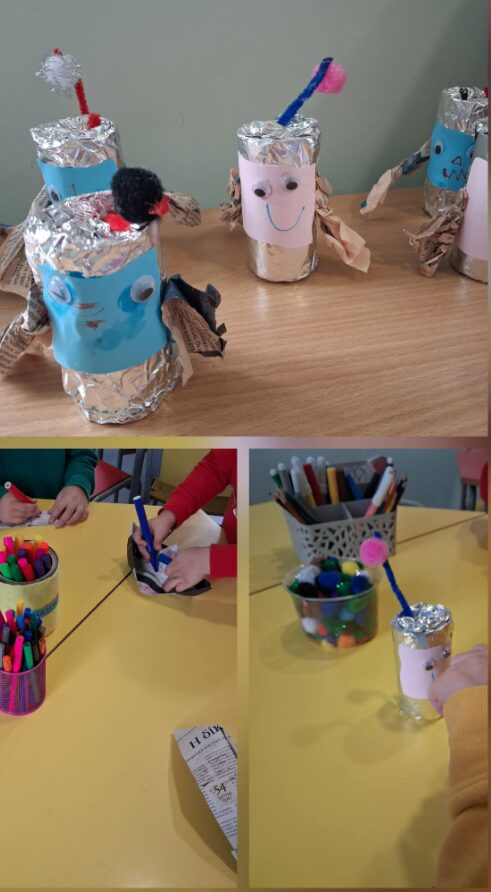 Είδαμε πώς τα σκουπίδια γίνονται τέχνη! Εμπνευσμένοι από τον ζωγράφο Didier Triglia, αποφασίσαμε ότι τίποτα δεν πάει χαμένο! Μεταμορφώσαμε παλιά υλικά σε απίθανα έργα τέχνης, δημιουργήσαμε κατασκευές από ανακυκλώσιμα υλικά, φτιάξαμε ομαδικές αφίσες και γεμίσαμε το σχολείο μας χρώματα και φαντασία.